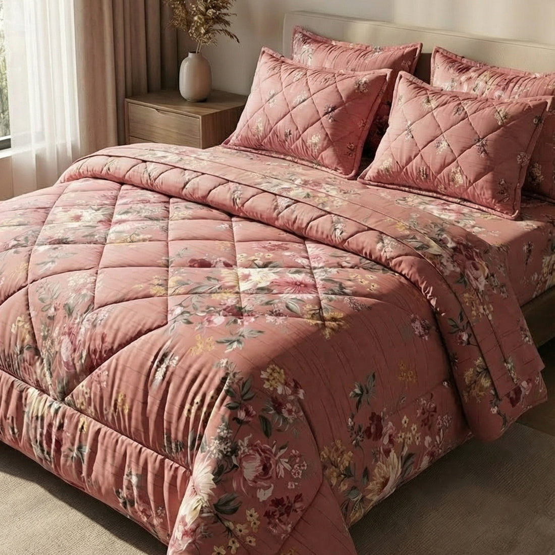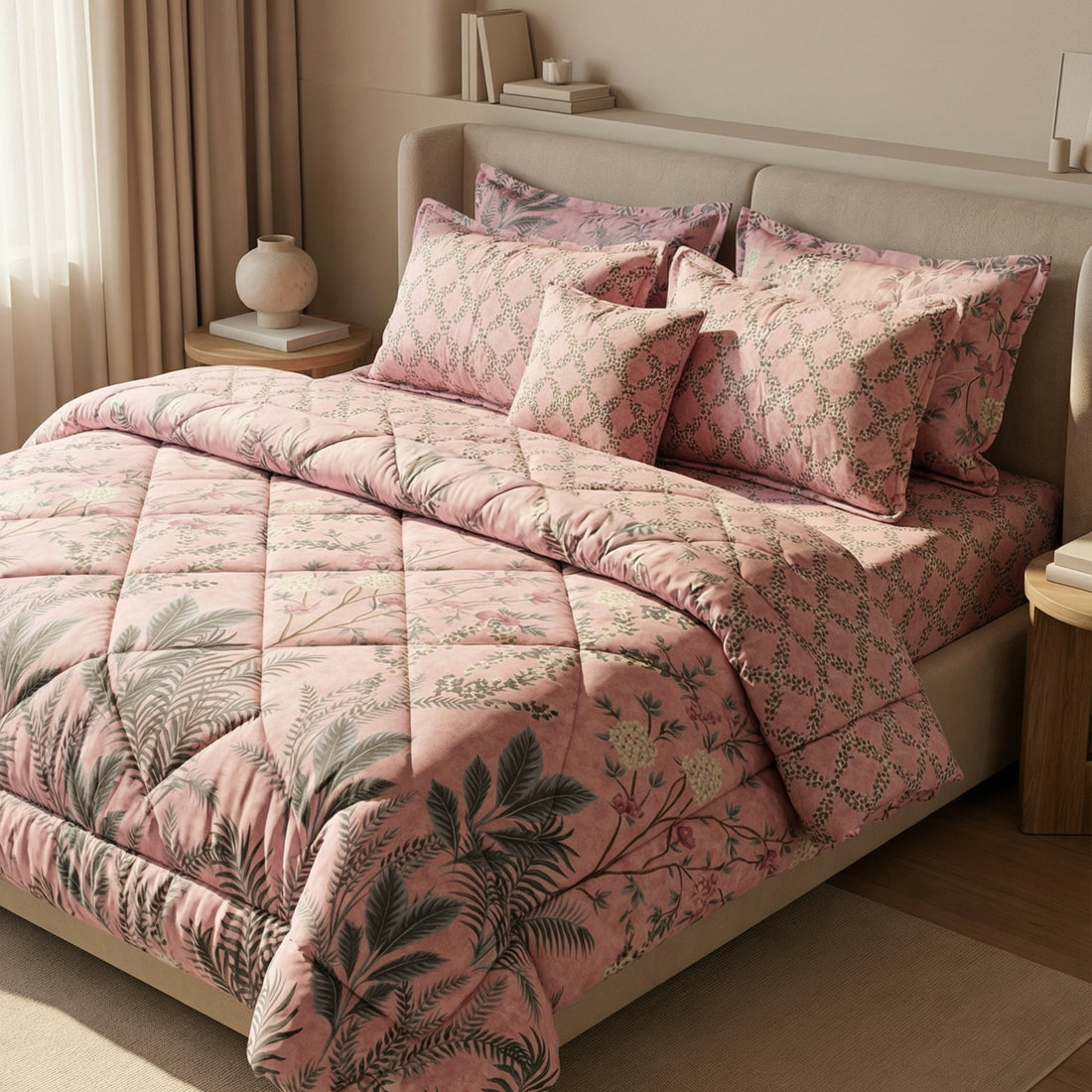 7-Piece Premium Printed Comforter Set – King Size | Floral Pink