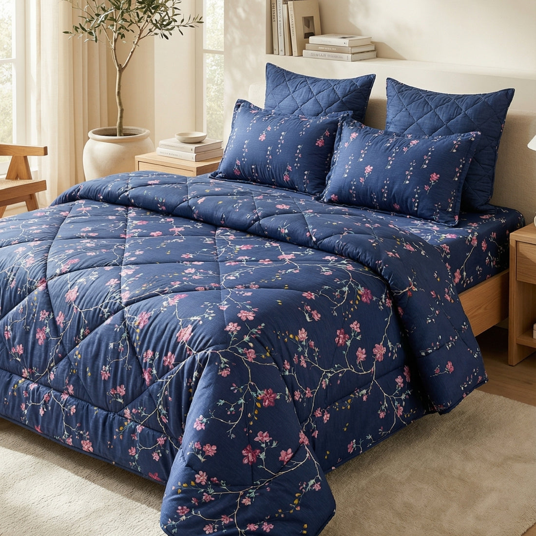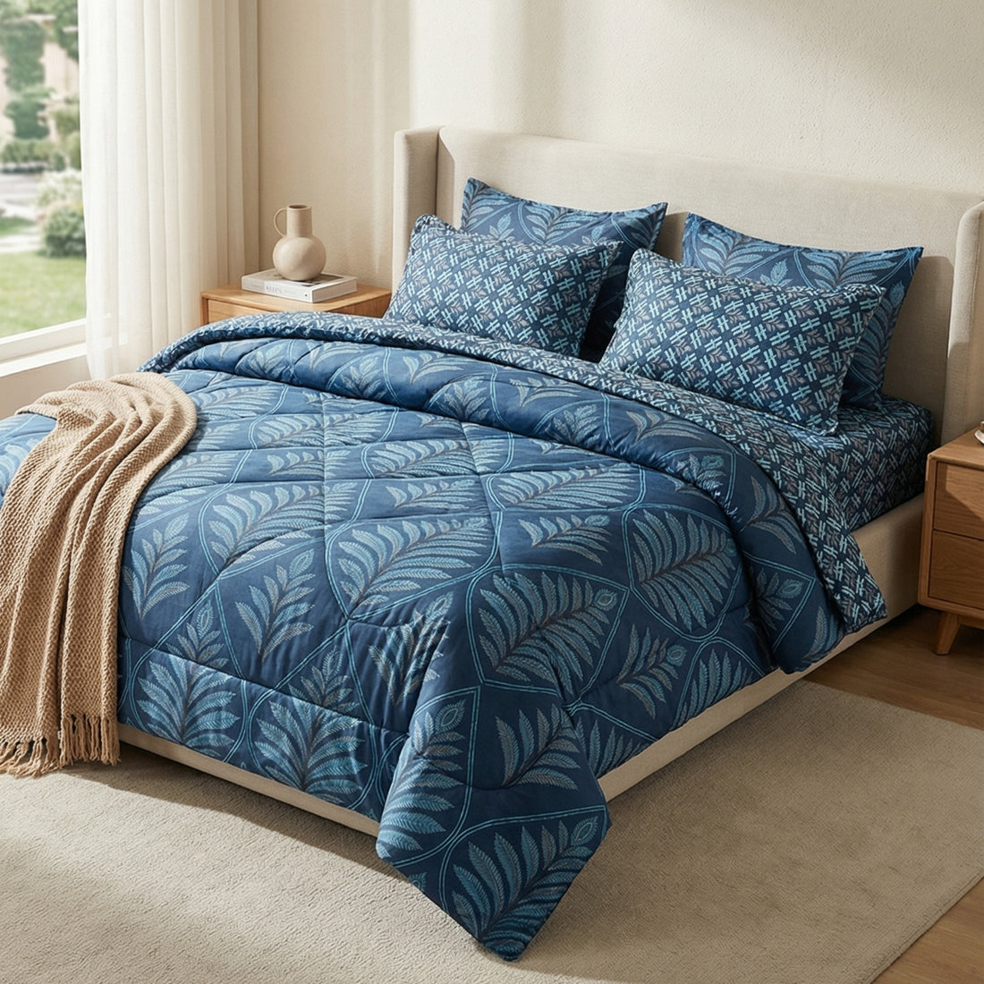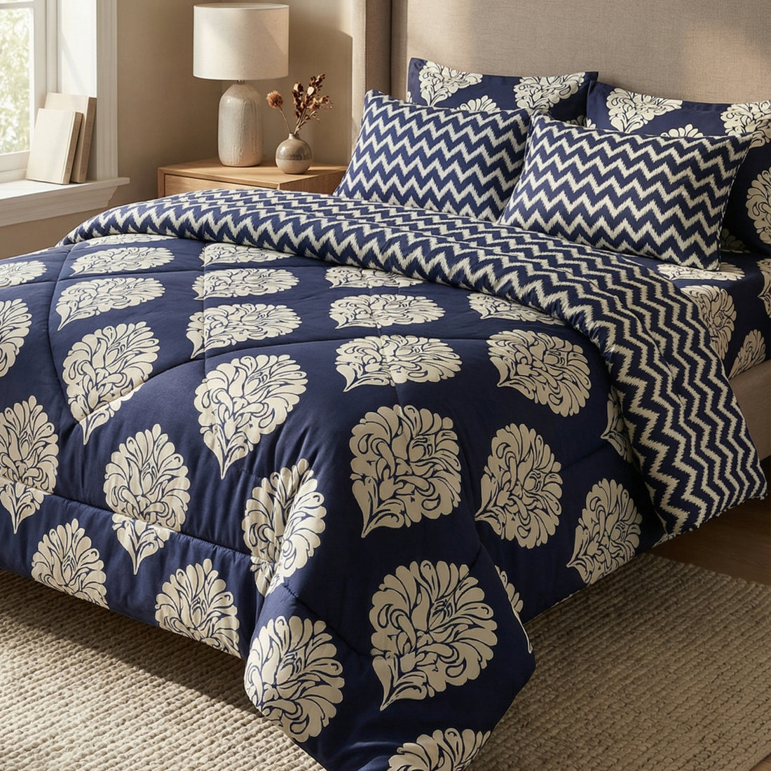 7-Piece Premium Printed Comforter Set – King Size | Dark Blue