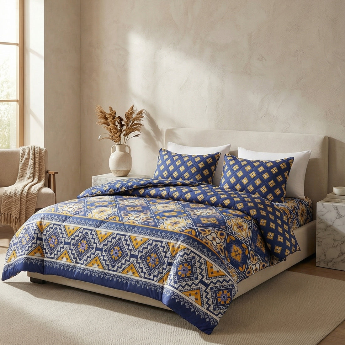 7-Piece Premium Printed Comforter Set – King Size | Blue/Musturd
